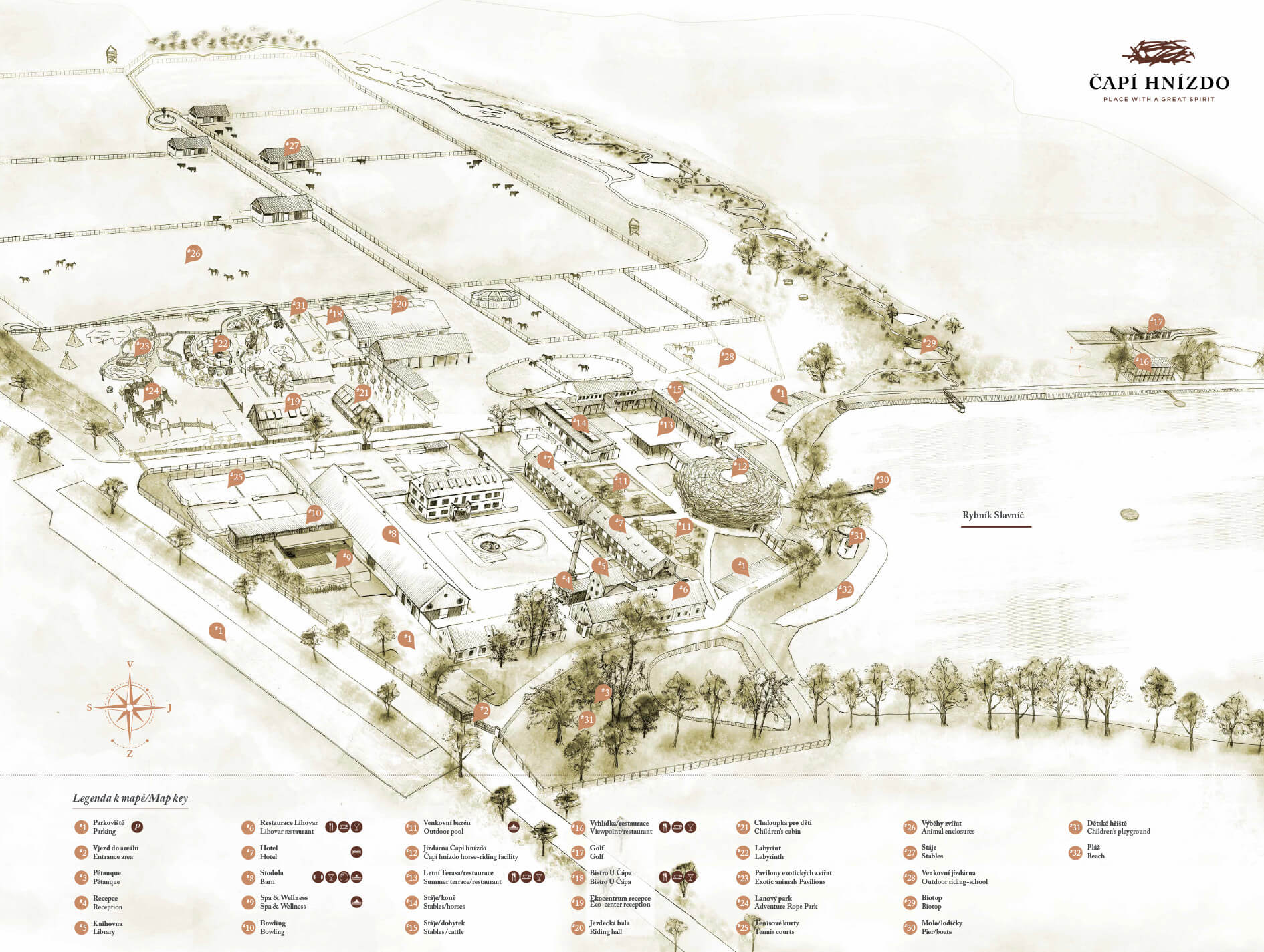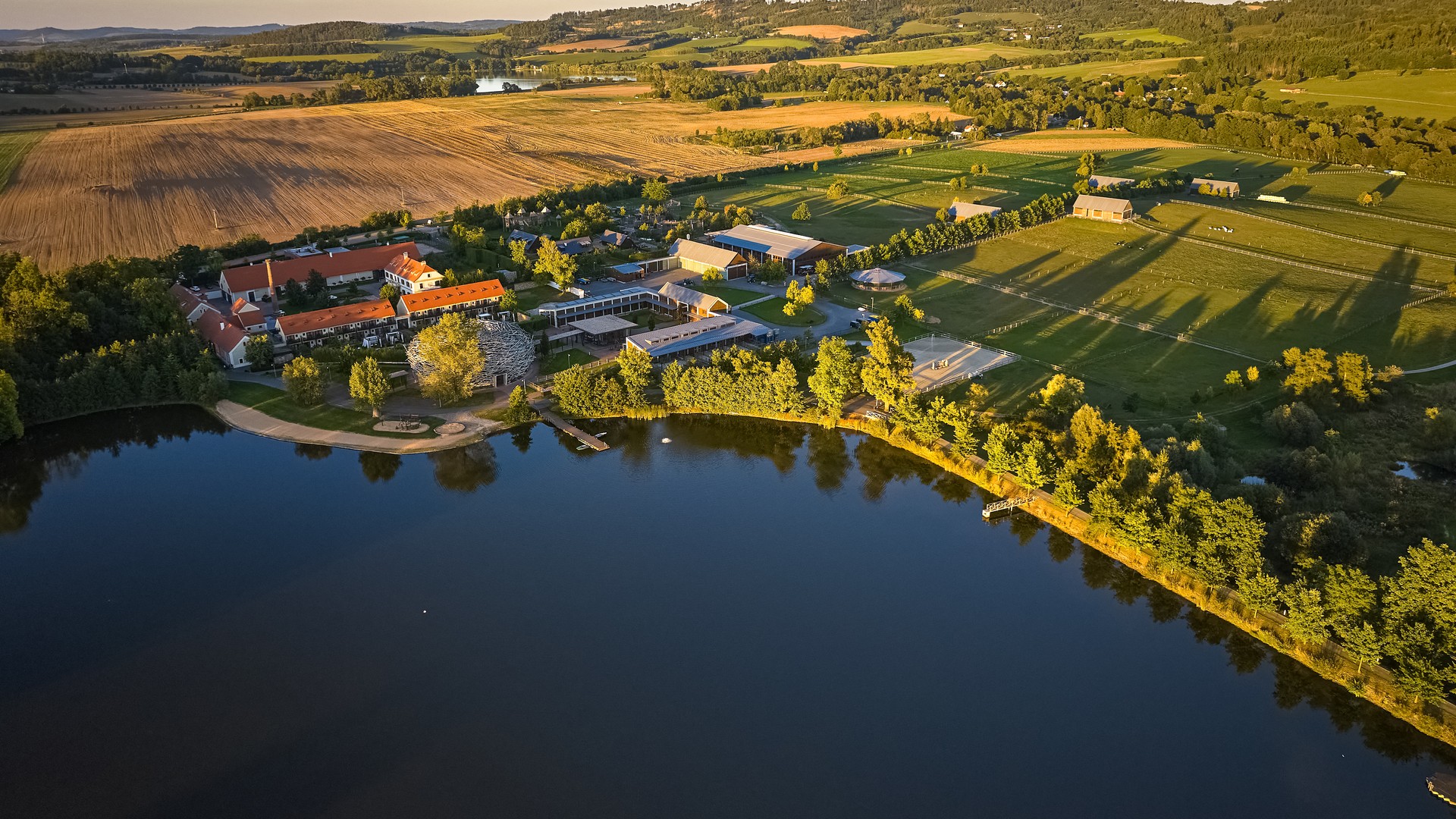 The dominant feature is the modern riding hall, which evokes a heron's nest. The herons, which have been resident here since 1926, return every year from Africa. When building our resort, the primary goal was to create a unique place where guests would love to return. A place where they can spend time in complete harmony with nature and the surrounding landscape.