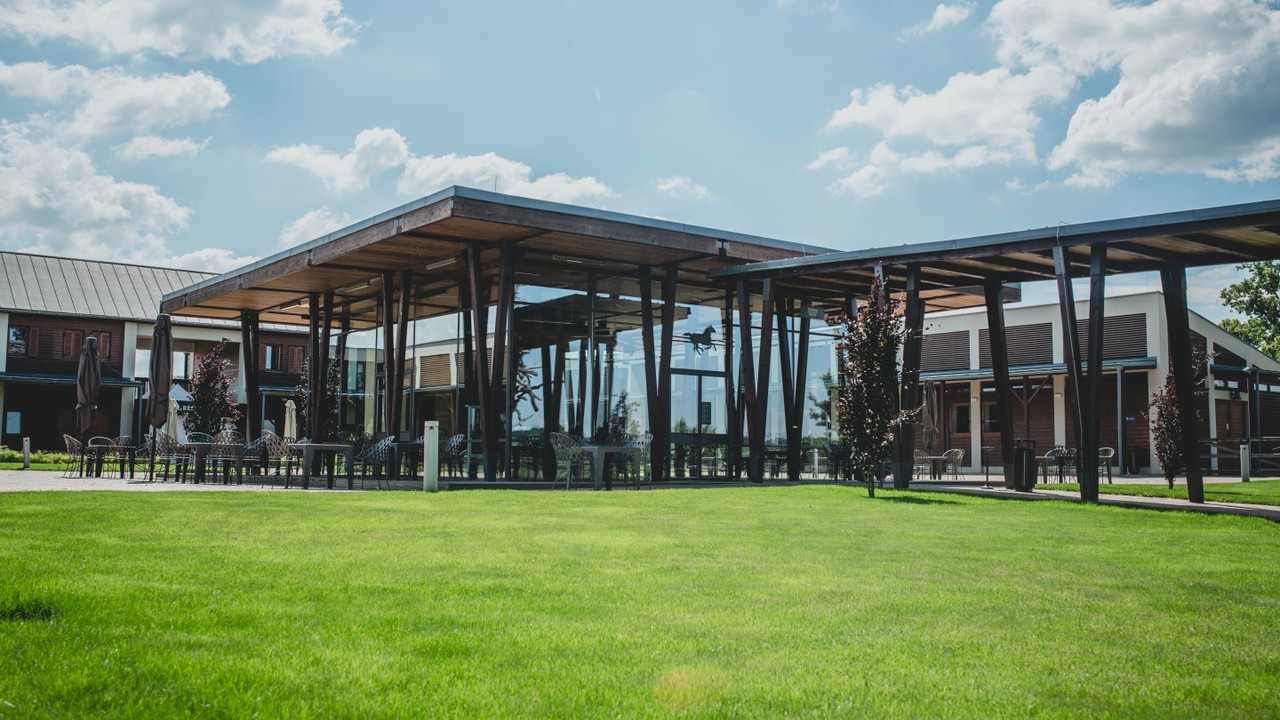 Prosklený prostor vhodný pro uspořádání menších akcí, jehož součástí je i krytá terasa.