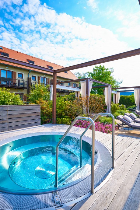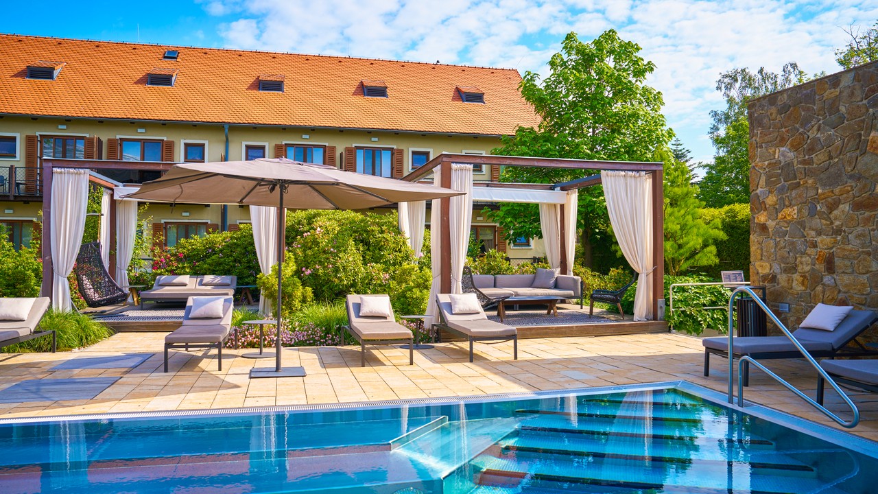 Venkovní bazén s vířivými vodními prvky, dětské brouzdaliště se skluzavkou, venkovní vířivka, odpočinková zóna včetně lehátek a gazeb - to všechno je k dispozici ubytovaným hostům.