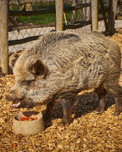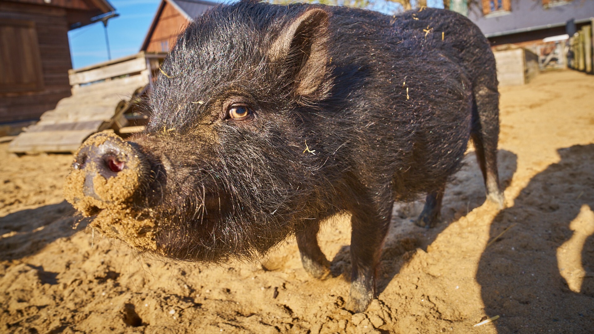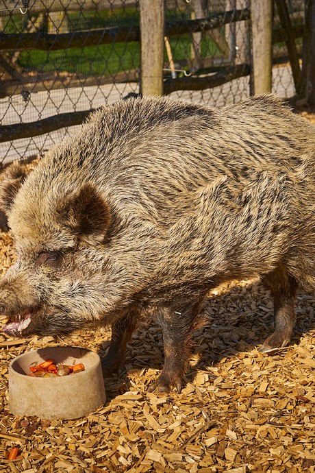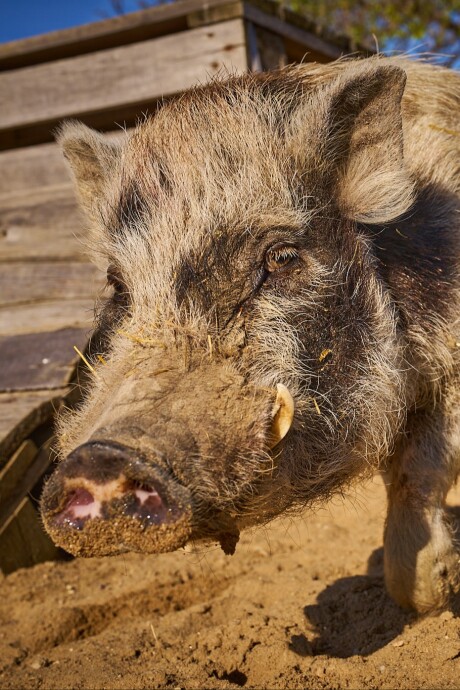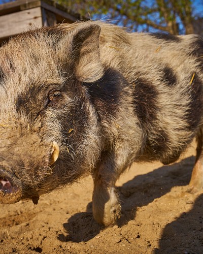 Náš strakatý samec jménem Rozínek je snadno ochočitelné, chytré, společenské a učenlivé zvíře. Kromě Rozínka můžete na dvorečku vidět ještě černá prasátka Fionku a Zora.